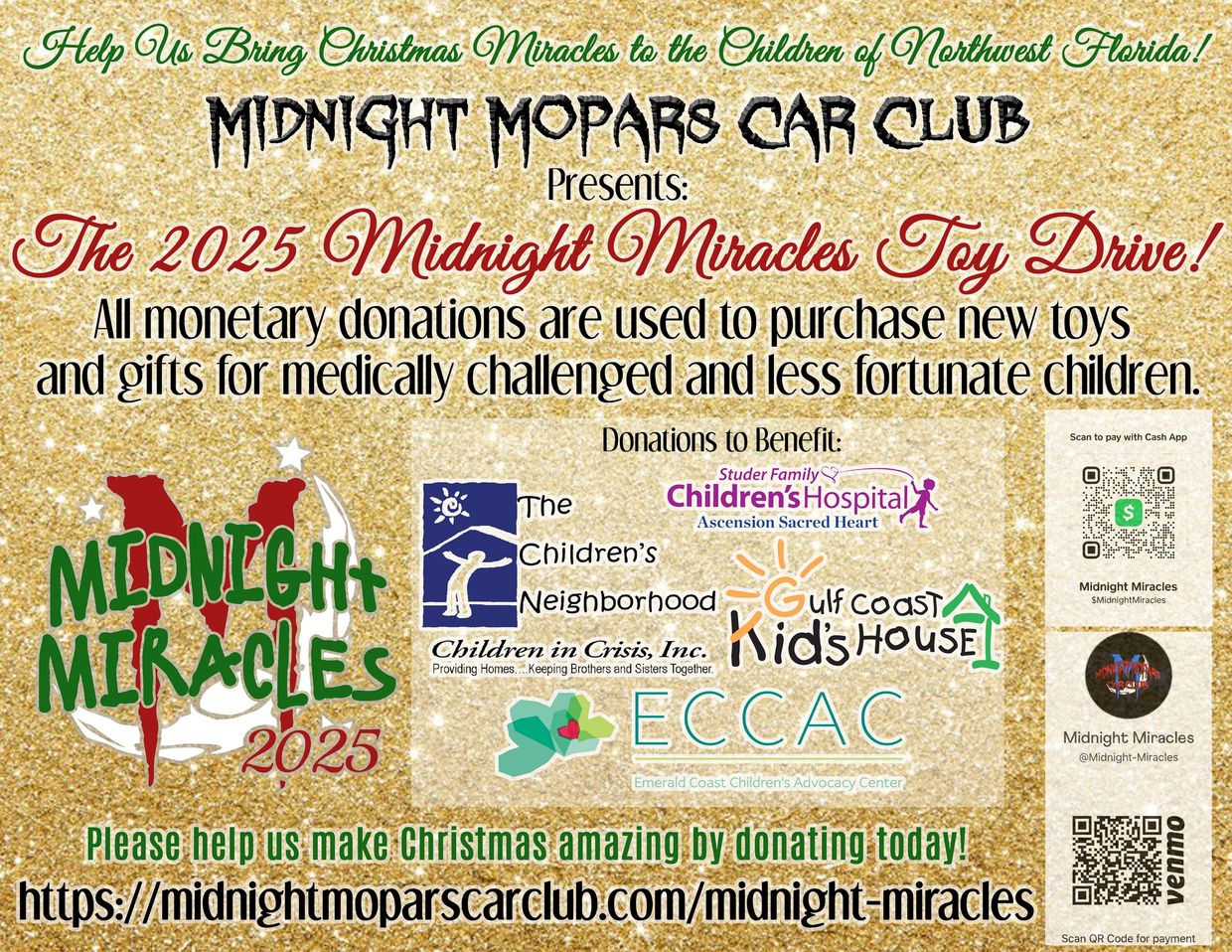 Midnight Mopars Car Club is hosting our annual Midnight Miracles Toy Drive & Ride for the Christmas Season 2025! This will be our sixth year collecting and purchasing donations for our local kids in need. Help us make this the GREATEST Christmas yet!!